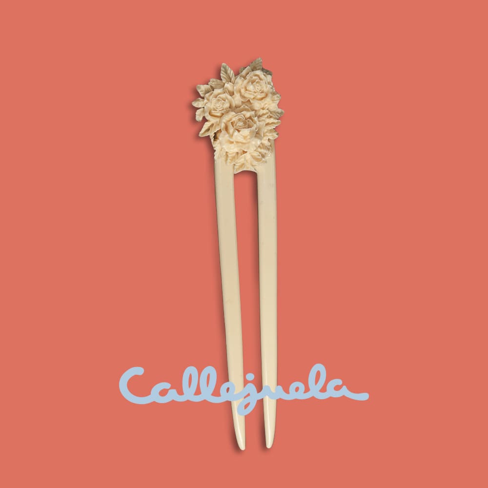 Agujón de resina color hueso adornada con flor.