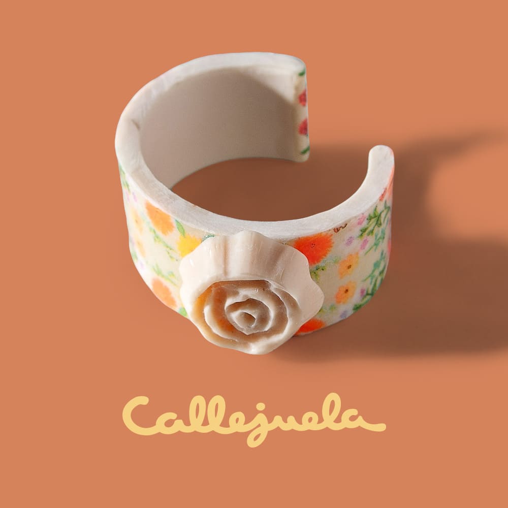 Brazalete abierto de resina adornado con decoupage y flor de resina.