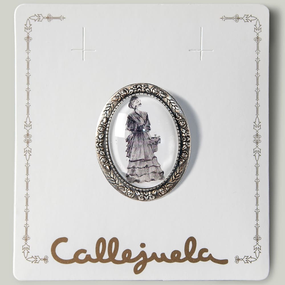 Broche de cabuzón de vidrio sobre base de metal, con ilustración original de Margarita González.