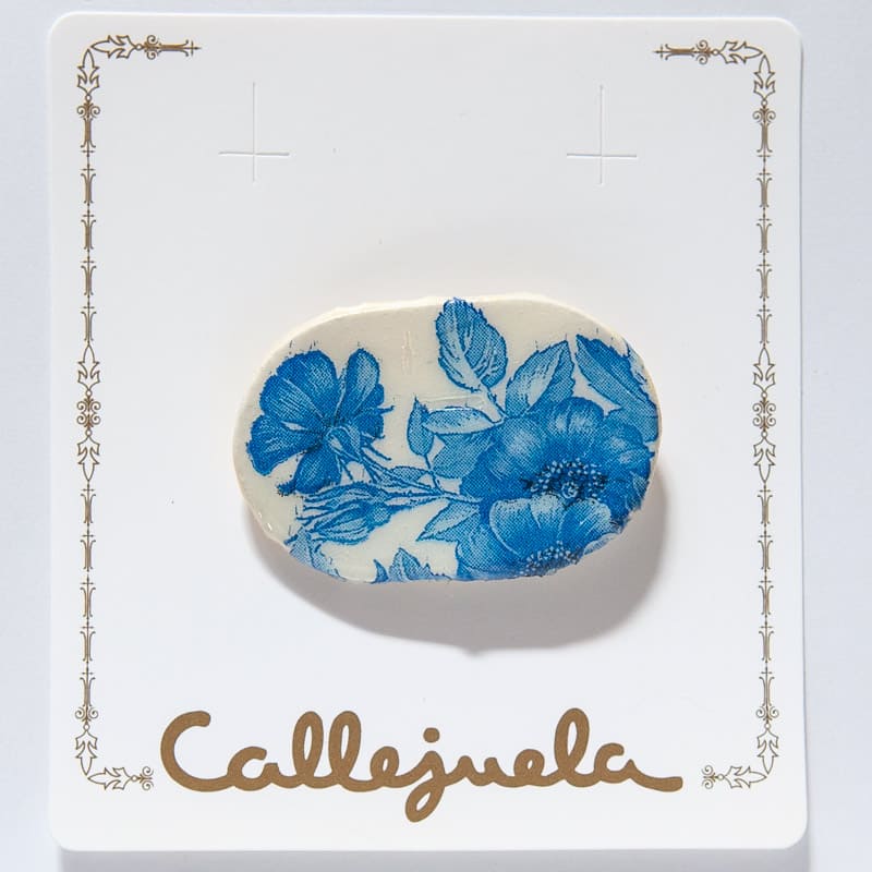 Broche de barro, adornado con decoupage de flores y capa final de resina.